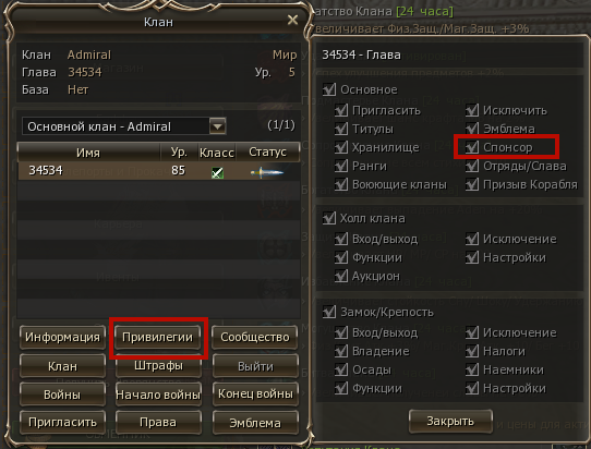 Якщо Ви є лідером клану, права на купівлю іншим членам клану можна видати дуже просто, виставивши галочку "Спонсор".